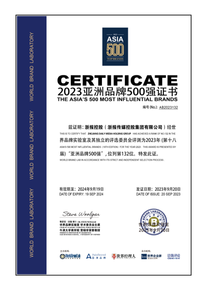 浙报集团以“争创新时代一流党报集团”为发展目标,加快推进媒体深度融合,积极布局“五个走在前”即“党媒姓党走在前”“融合传播走在前”“文化引领走在前”“产业发展走在前”“党的建设走在前”。集团现有5200多名员工,拥有浙江日报、浙江在线、钱江晚报、《浙江共产党员》杂志、浙江法治报、《浙商》杂志、美术报、浙江老年报等媒体16家,重点打造省级重大新闻传播平台核心战舰“潮新闻”客户端,拥有微博、微信、抖音号、头条号等组成的多个新媒体矩阵。传播力影响力位居国内同类媒体第一方阵前列,连续多年入选“中国500最具价值品牌”“亚洲品牌500强”“世界媒体500强”。